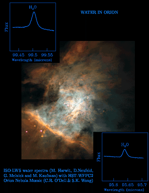 The central panel is an image of the Orion nebula taken with the Wide Field Planetary Camera 2 (WFPC2) on NASA's Hubble Space Telescope (HST) and shows the region of space where the water vapor was detected.